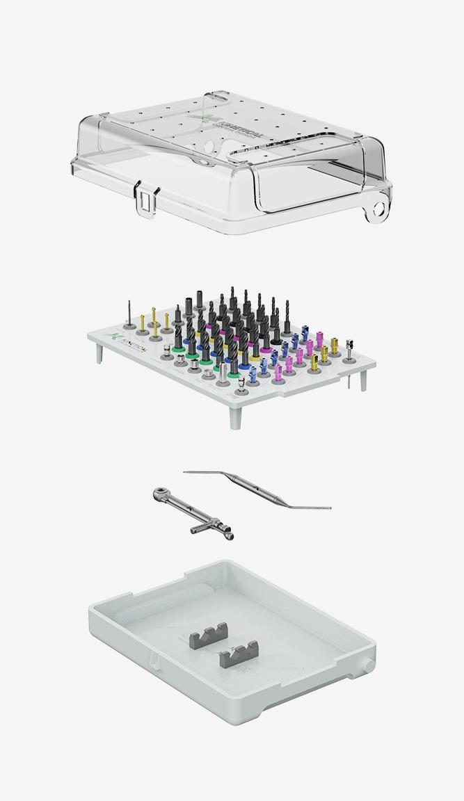 El kit de cirugía guiada Kinetical proporciona precisión y rapidez en el procedimiento quirúrgico. Este ha sido diseñado con una gama completa de fresas e instrumentos para ser utilizado desde la preparación del lecho implantario hasta la colocación final del implante.