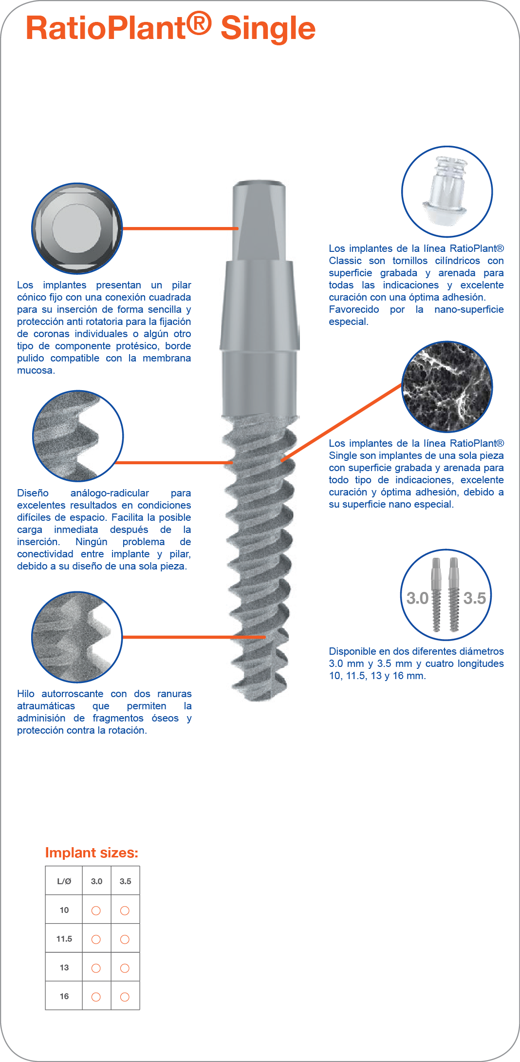 Los implantes dentales se fabrican en titanio, el cual, es un material compatible con el cuerpo y en específico con el hueso humano; por lo que se han utilizado durante muchos años. Diversos estudios han demostrado que la curación y la adhesión del hueso al implante dependen significativamente de la superficie. Como resultado, los implantes RatioPlant® presentan la última generación de superficies arenadas y grabadas. Hay que hacer una distinción entre los implantes, la presentación de los implantes puede ser de dos piezas o de una sola pieza.